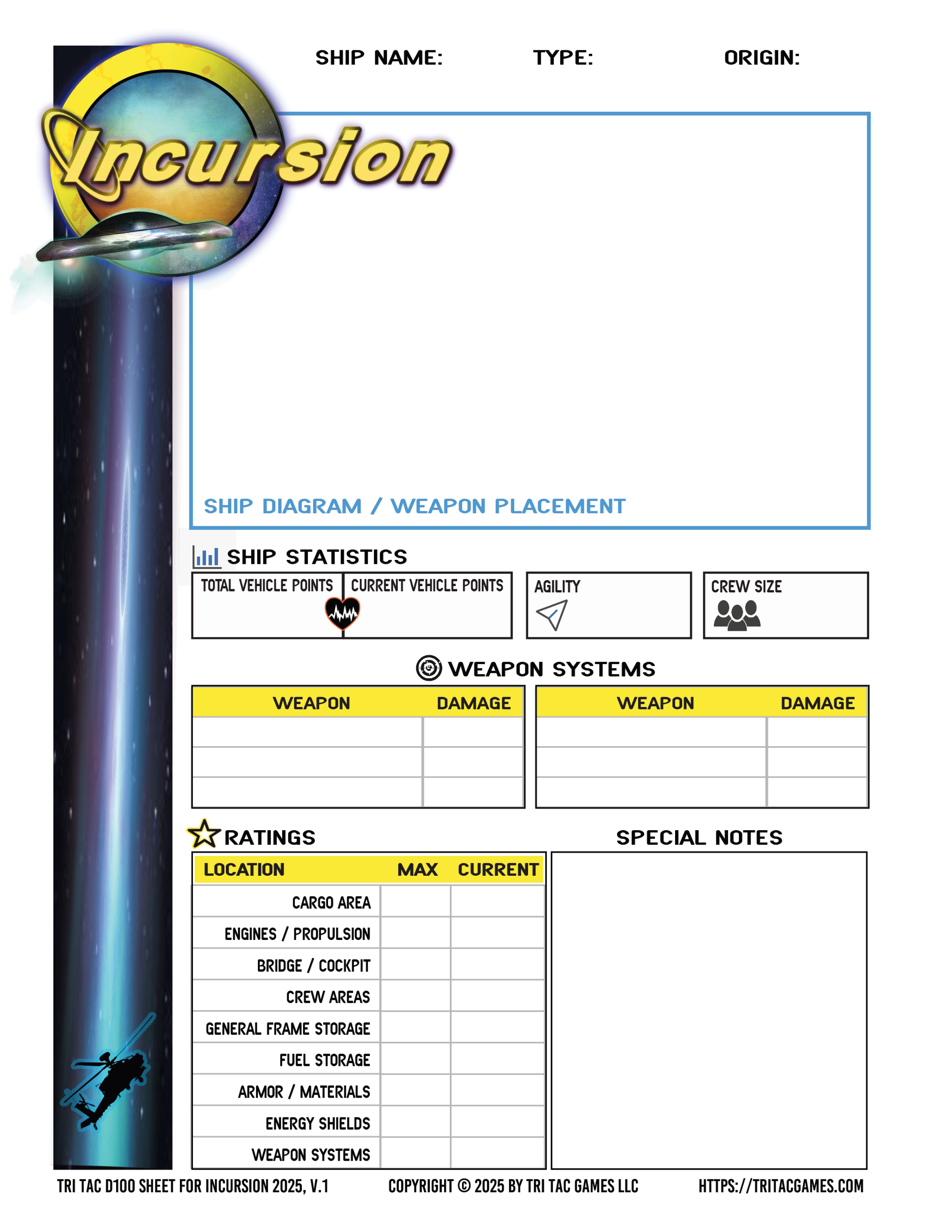 d100 Ship Sheet (PDF): Incursion d100 Vehicle Sheet